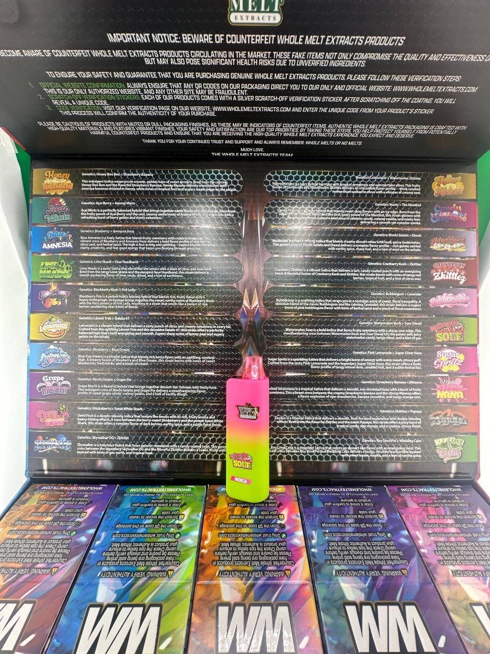 The Dual Chamber Watermelon Sour Disposable Vape by Whole Melt Extracts delivers a perfectly balanced fusion of sweet and tangy delight. Powered by two legendary strains — Watermelon Kush × Sour Diesel — this dual chamber edition offers a terpene-rich experience unlike any other.
